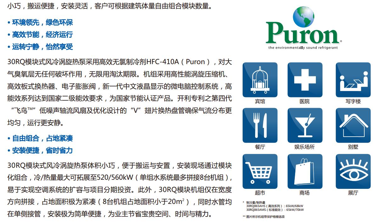 30RQ065 - AquaSnap 30RQ模塊式風冷渦旋熱泵 型號:30RQ065 制冷量:6kW( kW) 制冷劑:HFC-410a 產品特點:...
