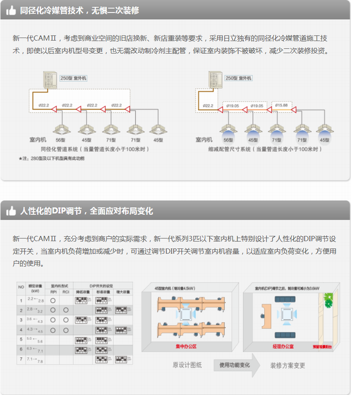 日立中央空調(diào)時(shí)代新生,為夢(mèng)想而來(lái)。日立懂得高端商業(yè)空間的高品質(zhì)、高舒適度的新生要求,專為中小型商鋪開(kāi)發(fā)新一代CAMⅡ商用中央空調(diào)(Commercial Advanced Multi Air-condition)。通過(guò)日立優(yōu)越的多聯(lián)機(jī)先進(jìn)技術(shù),以豐富多彩的室內(nèi)機(jī)產(chǎn)品形式、多種人性智能化設(shè)計(jì)、多項(xiàng)領(lǐng)先的節(jié)能技術(shù)以及智能強(qiáng)大的控制系統(tǒng),全方位實(shí)現(xiàn)中小型商用空間對(duì)環(huán)境時(shí)尚舒適、高效節(jié)能等高品質(zhì)夢(mèng)想。 CAMⅡ 變頻多聯(lián)機(jī)系列產(chǎn)品特點(diǎn): 1、美觀舒適,高檔典雅,高品質(zhì)環(huán)境必備 機(jī)身厚度小,僅為270mm,節(jié)省安裝控件;安裝靈活,滿足多種安裝要求,用心締造高端完美空間,提升空間品質(zhì)。 2、美觀舒適,高檔典雅,高品質(zhì)環(huán)境必備 機(jī)身厚度小,僅為270mm,節(jié)省安裝控件;安裝靈活,滿足多種安裝要求,用心締造高端完美空間,提升空間品質(zhì)。 3、同徑化冷媒管道系統(tǒng),節(jié)省二次裝修投資 獨(dú)有的同徑化冷媒管道施工技術(shù),將來(lái)如果室內(nèi)機(jī)型號(hào)變更,不需改動(dòng)制冷劑主配管,保證室內(nèi)裝飾不被破壞,減少二次裝修投資。 4、同徑化冷媒管道系統(tǒng),節(jié)省二次裝修投資 獨(dú)有的同徑化冷媒管道施工技術(shù),將來(lái)如果室內(nèi)機(jī)型號(hào)變更,不需改動(dòng)制冷劑主配管,保證室內(nèi)裝飾不被破壞,減少二次裝修投資。 5、系統(tǒng)運(yùn)行能效高,為業(yè)主節(jié)省更多費(fèi)用 領(lǐng)先的I...