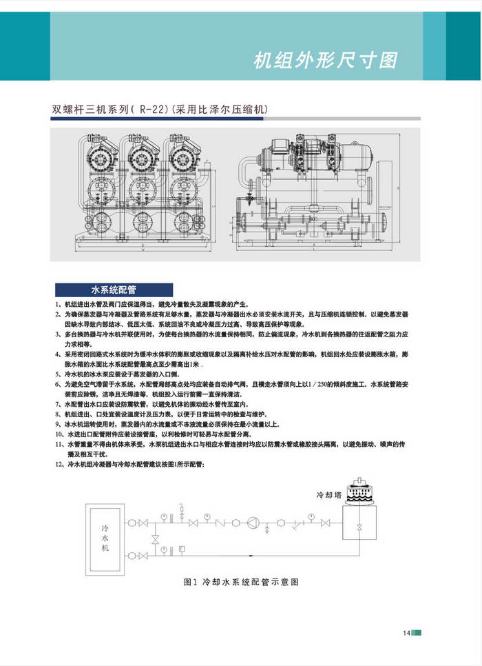 水冷冷水機(132KW-2160KW) 單螺桿機采用三菱電機進口壓縮機,使得高低壓之間串氣減至最小, 保證機組低噪音、平穩(wěn)性和高可靠性 雙螺桿機采用高效率螺桿式壓縮機,壓差方式給油,無需外加油泵 配置SIEMENS人性化微電腦控制系統(tǒng) 強大的研發(fā)能力可為客戶特別設(shè)計非標產(chǎn)品 采用綠色、環(huán)保的R-134a制冷劑...